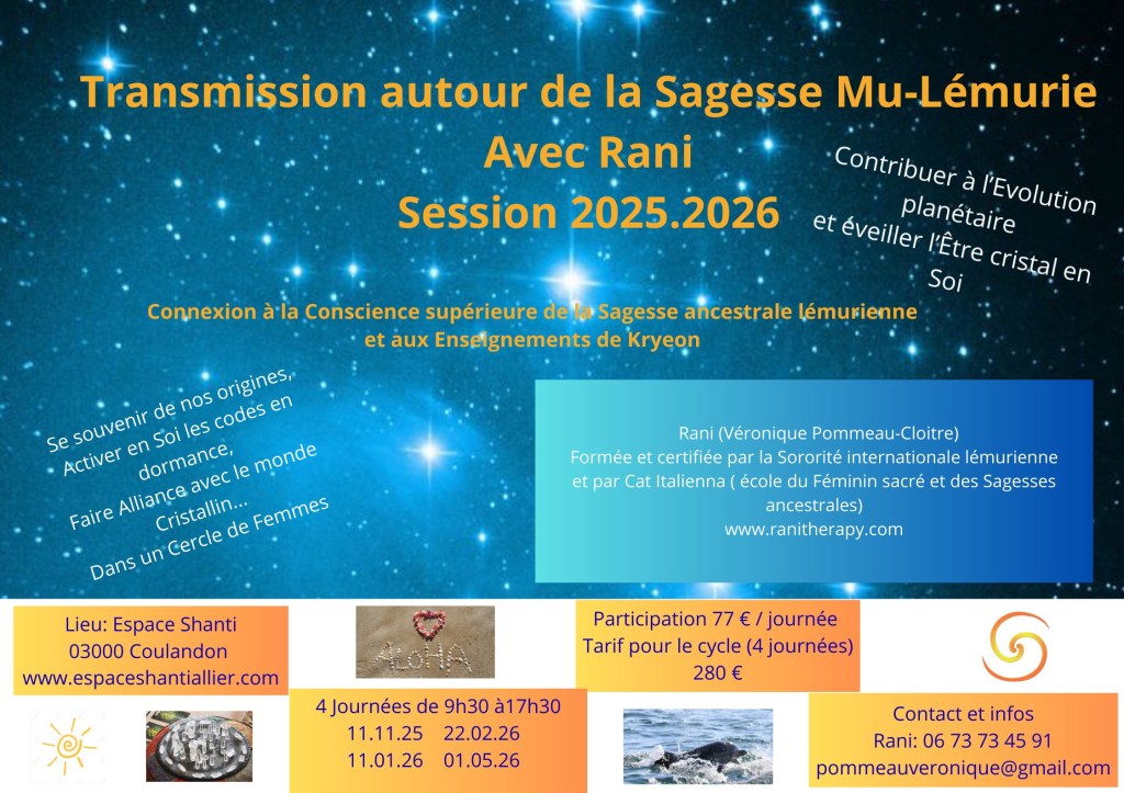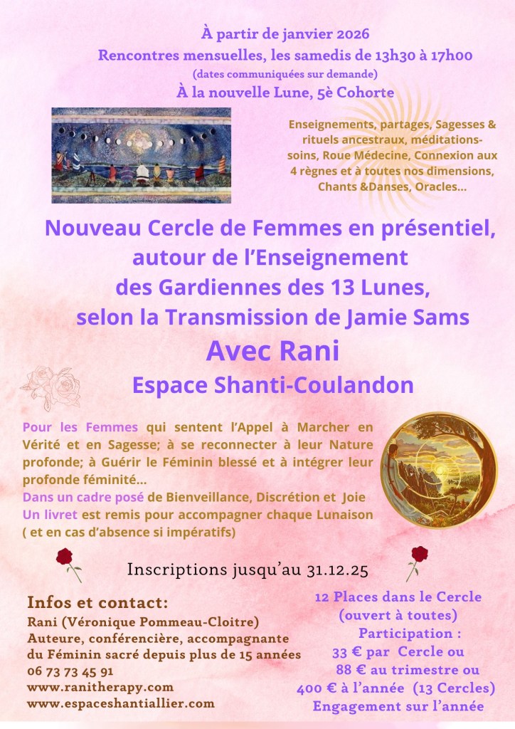 Enseignement des gardiennes des 13 lunes selon la transmission de Jamie Sams; cercles de méditation et bénédiction de l’Uterus selon l’enseignement de Miranda Gray (Moon Mother® ); des stages sur le Féminin sacré, les Sagesses ancestrales, la Sororité Lémurienne, Les sceaux sacrés, la Roue médecine, Au Coeur du sacré… Initiations et Formations avec Véronique Pommeau sur ranitherapy.com